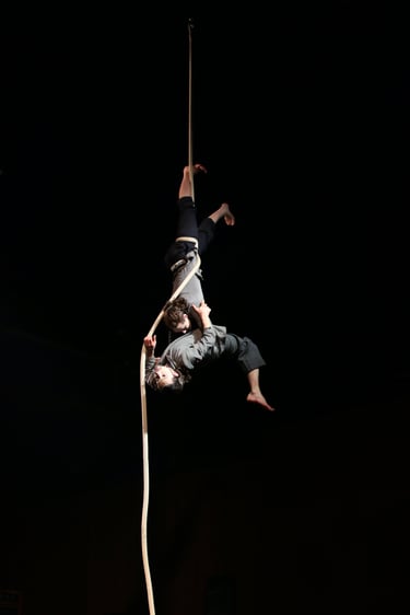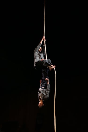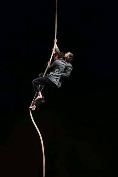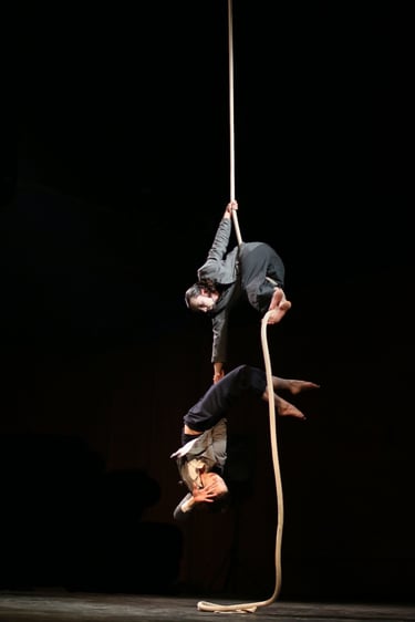 “Avec aise, elle aurait pu offrir sa danse, récolter les louanges, saluer et s’en aller... Elle s’y croyait, lui ne demandait qu’à y croire. Né de la dernière danse, surpris de sa propre existence, il rit. Cherchant à se défaire des méfiances qu’ont tissées entre eux leurs maladresses, ils s’apprivoisent à coup de corde et de tendresses. Réunis par mille et une facettes de leurs agrès, ils avancent vers un futur d’où ils se souviendront qu’une corde a vécu. C’est une histoire pleine de performance circassienne, de poésie abstraite, d’humour décalé, de tango, de marionnettisme et de brouette.”